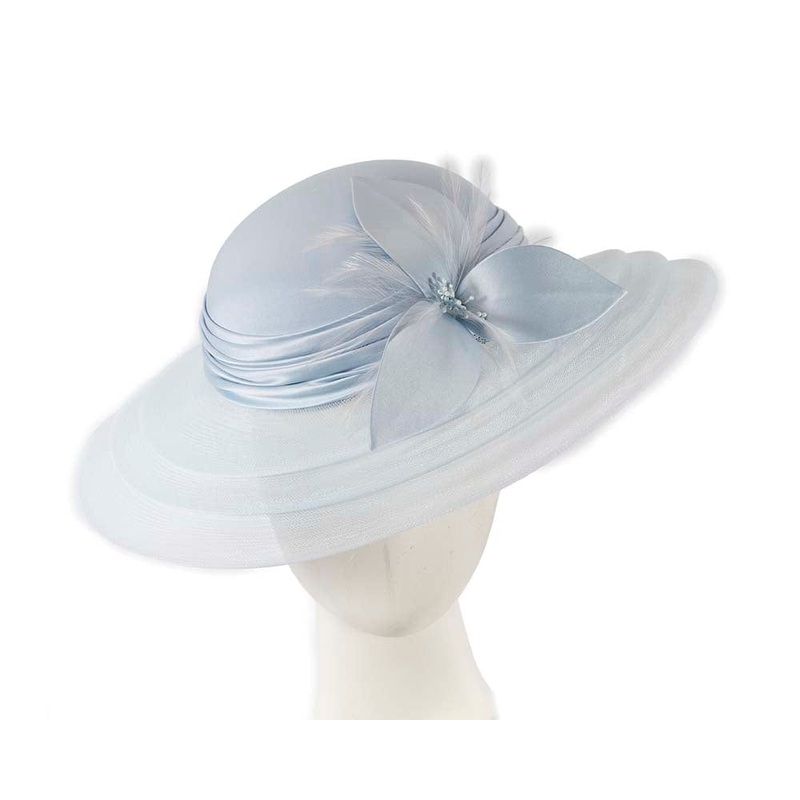 This stunning hat from our beautiful range of mother of the bride, evening, church and special occasion hats is hand made from luxurious fabric with crinoline brim and elegant trim. Hat is fully lined and has comb for comfortable wearing. This designer fas