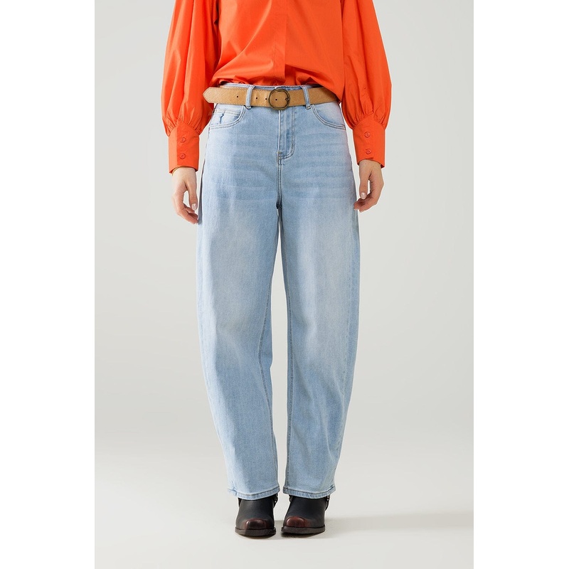 These light blue denim bubble leg jeans bring a modern twist to classic denim, offering a flattering high-rise waist that elongates the legs while ensuring all-day comfort. With a relaxed fit and a unique curved silhouette, these jeans break away from trad