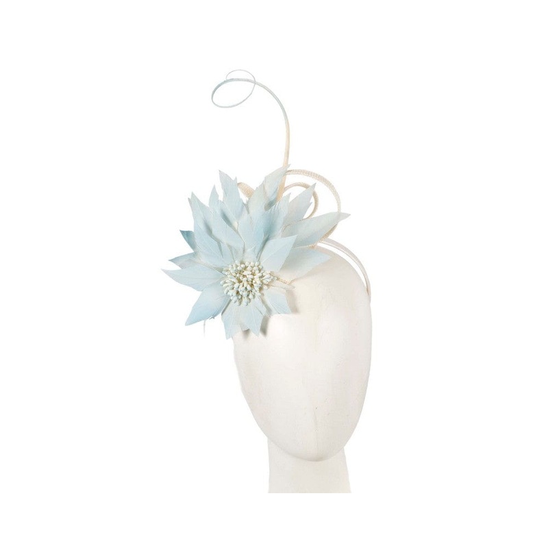 Multi-tone light blue feather flower on the headband with addition of a long feather.This elegant fascinator will complement your spring racing outfit. Designed and completed in Australia Legendary Max Alexander brand