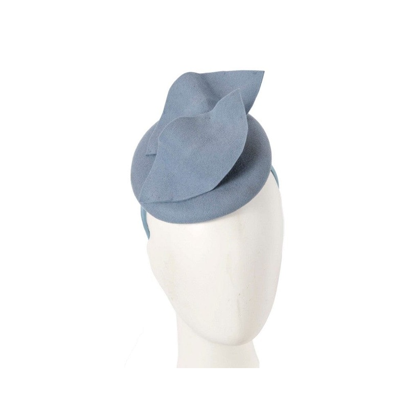 Designed in Melbourne and hand made to perfection, this gorgeous light blue winter racing fascinator sports round felt base with elegant wave decoration. Designed in Australia Renown Max Alexander brand Real wool felt Headband