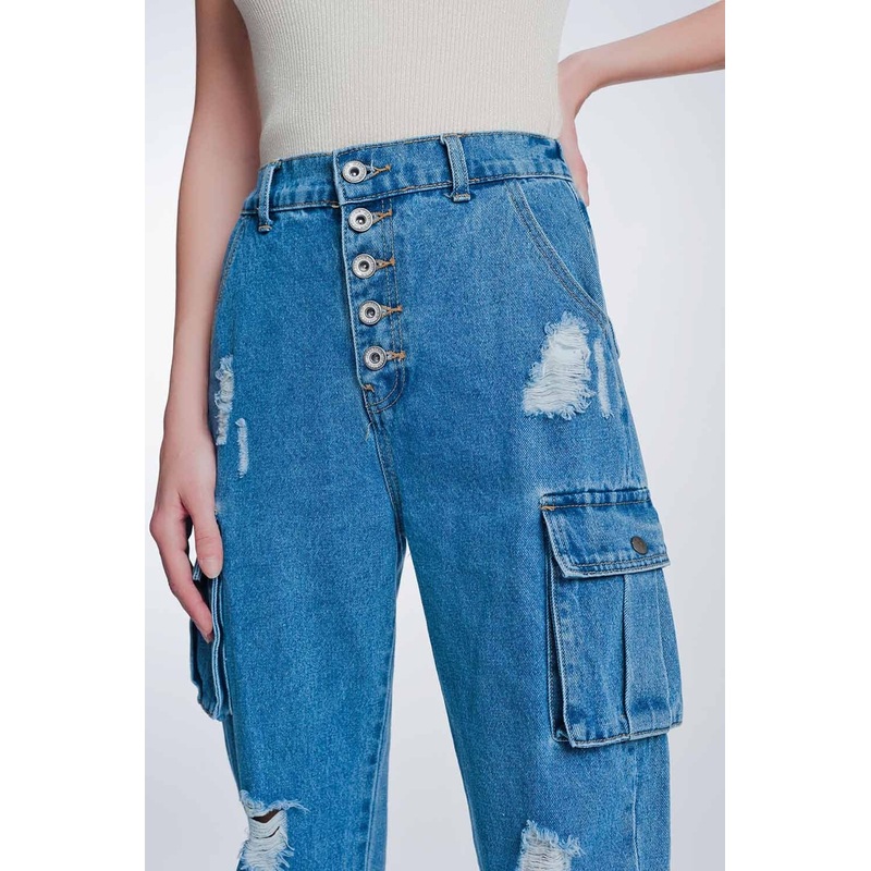 Light Denim Straight Jeans Ripped with Side Pockets. These boyfriend jeans offer so many cute styling elements. Of course, the buttons in the front are classic. The cargo pockets on the sides, ripped detailing, and stretchy blue denim complete the look. Pa