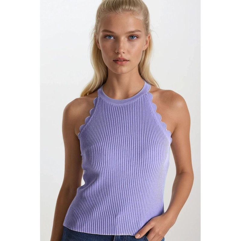 Soft and modern, this light purple tank top blends feminine color with contemporary design. The bodycon fit is enhanced by ribbed underarm detailing, adding subtle texture while maintaining a sleek, flattering silhouette. Its pastel tone brings a gentle po