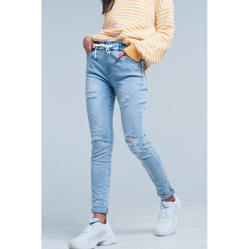 Perfect for the warmer weather, this jogger boasts of lightweight fabric in a very light wash. These jeans have a tasteful amount of the trendy ripped styling. The fabric is very elastic and stretch. The elastic waistband is adjustable with the drawstring