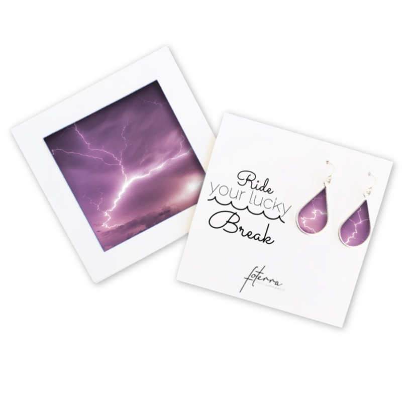 Add a touch of the sublime to your look with these unique Lightning earrings. They depict a bolt of lightning striking over stormy Midwest skies perfect for anyone who loves the power and mystery of nature. Whether you’re dressing up for a special occasion or just accenting your everyday style, these earrings will electrify your look.