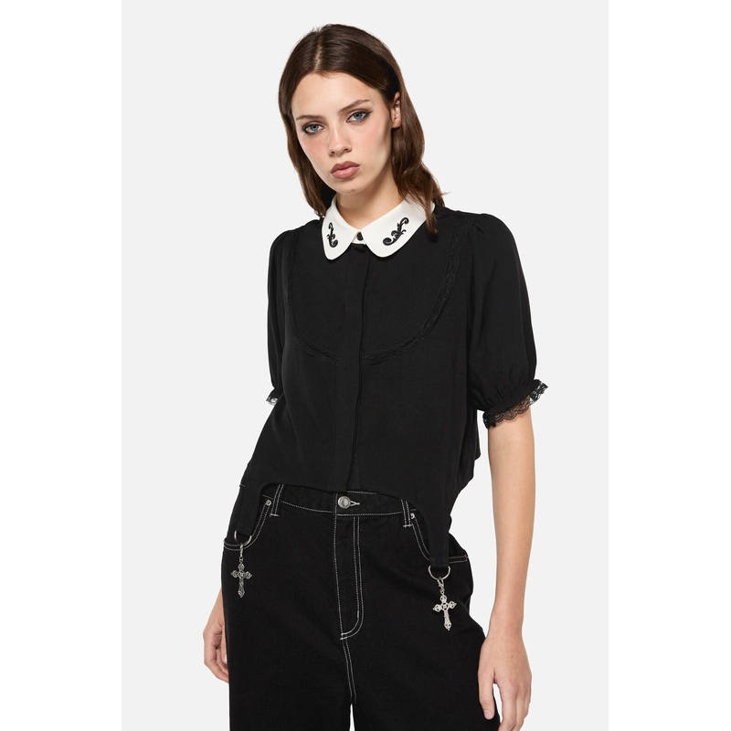 Gothic Style Cropped Blouse - Fitted Shape - Short, Puffy Sleeves - Contrast Colour Collar At Neckline - Ornate Embroidery Artwork On Collar - Garter Belt Style Detail On Front - Lace Trim Details - Button Down Closure At Front - Made From Cotton - Availab