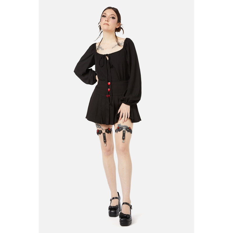 Little Devil Garter Set- A cute devilish garter set- Red "horn" spikes- Black vegan leather- Heart shaped ring- Silver toned hardware and studs- Elasticated backing- Comes in sizes S, M and LProduct Code: DWFY066