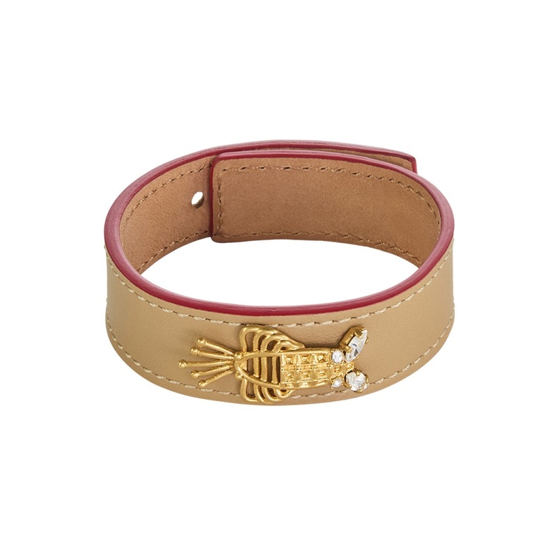 Sonia Petroffs trademark lobster puts in another stylish appearance with this bespoke Lobster Bracelet. The lobster is crafted from brass with 24 carat gold overlay and Swarovski diamonds set on a beige genuine Italian leather bracelet, which has three con