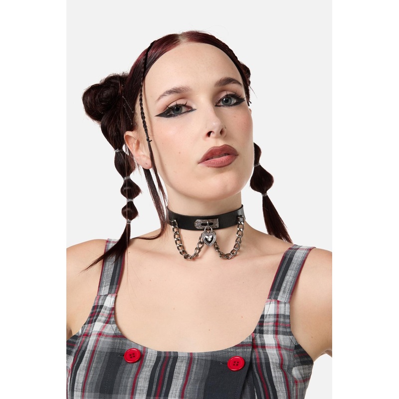 Locket Chain Choker- A pretty choker accessory- Heart shaped locket and chains- Hardware in a dark silver finish- Vegan leather- Buckle fastening- Available in black- Comes in sizes S, M and LProduct Code: DWFZ125