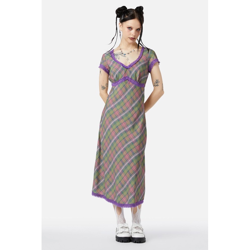 Vintage Look Tartan Dress -Features ‘Lola’ Diagonol Custom Tartan -Long Length Cut -Capped Sleeves -Includes Lace Trim Detail Around But And Neckline -Made From Viscose -Available In Multi
