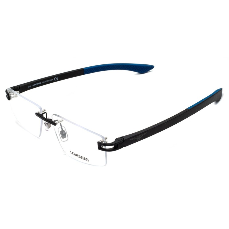 LONGINES Rimless Frames - 100% Authentic - LG5007-H 002Satin black metal framesMatte black acetate arms with blue textured inner arm endsAdjustable nose pads for a comfort fitBrand new - Never been wornLens Width = 56mmLens Height = 34mmBridge = 15mmTemple