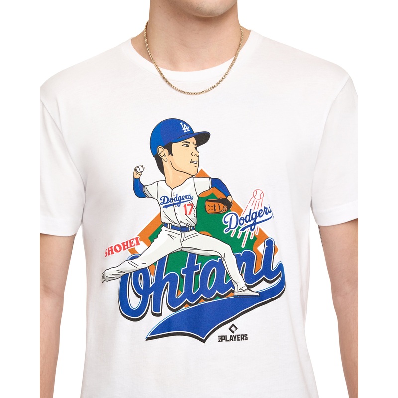 The Los Angeles Dodgers Shohei Ohtani White T-Shirt features a screen-printed Dodgers Shohei Ohtani pitching graphic at the front.