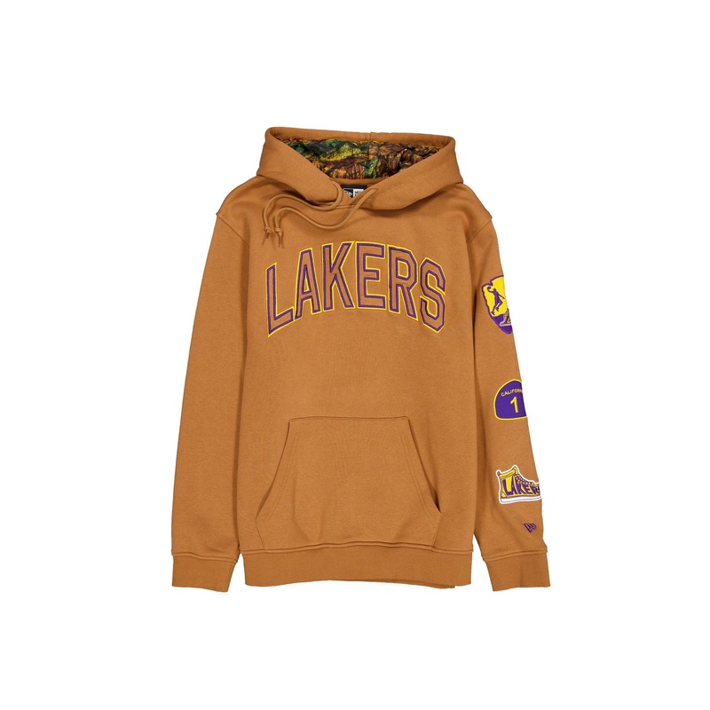 The Los Angeles Lakers 2025 All-Star Game Victory Grove Light Bronze Hoodie features an embroidered Lakers wordmark at the front with team patches at the left arm. Additional details include a forest print inner lining, kangaroo pockets, and adjustable dra