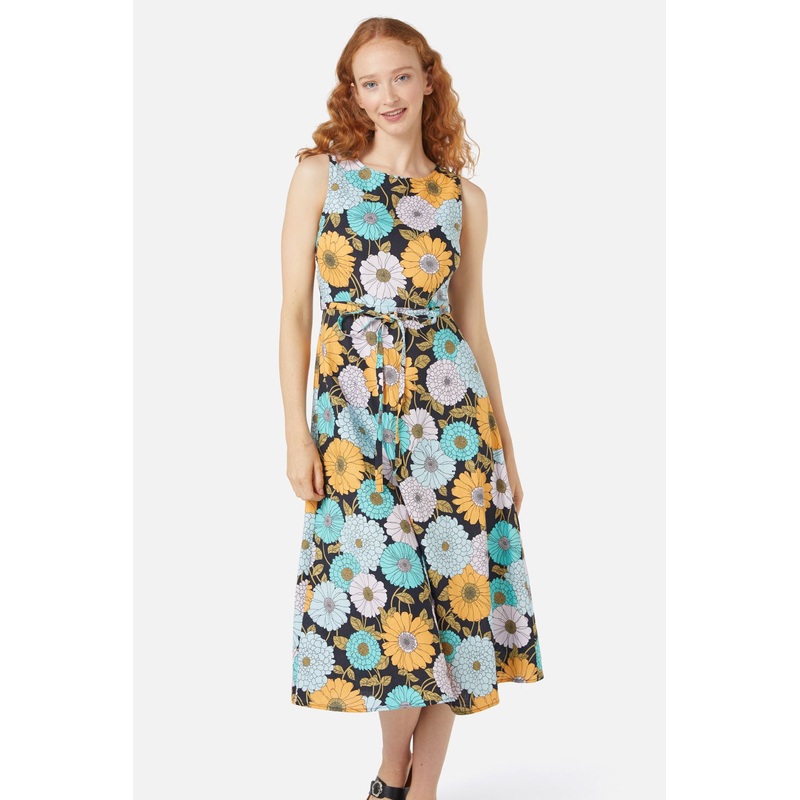 Retro floral printed midi dress- so fresh & very pretty, this 70s inspired floral has a gorgeous retro summer vibe- sleeveless semi-fitted bodice- a-line style skirt- midi length- invisible back zipper- thin removable waist tie- made of a linen cotton blen