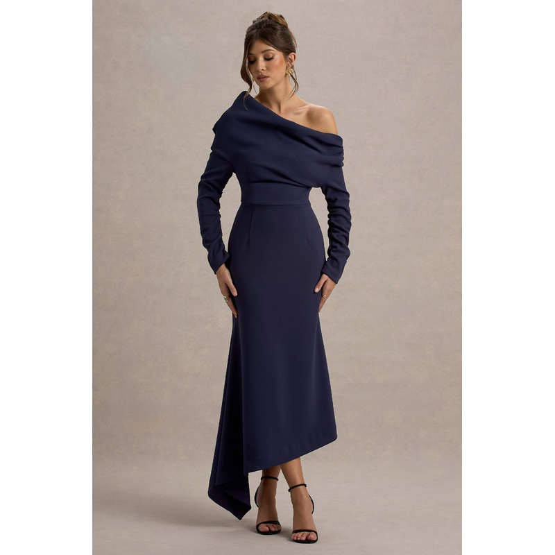 Embrace the wow-factor at every event in our latest navy maxi Lou. Presented in a premium crepe, this elegant choice is detailed with a graceful bardot neckline and flouncy asymmetric hemline. Style Lou with a sleek bun foran iconic graduation look.Feature