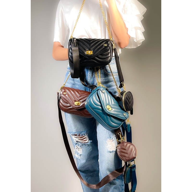 This trendy, quilted crossbody bag, in a range of fashionable colors, offers versatility and style.It features a secure flap closure with a metallic clasp and has a well-organized interior. A highlight is the inclusion of two straps: an adjustable crossbod