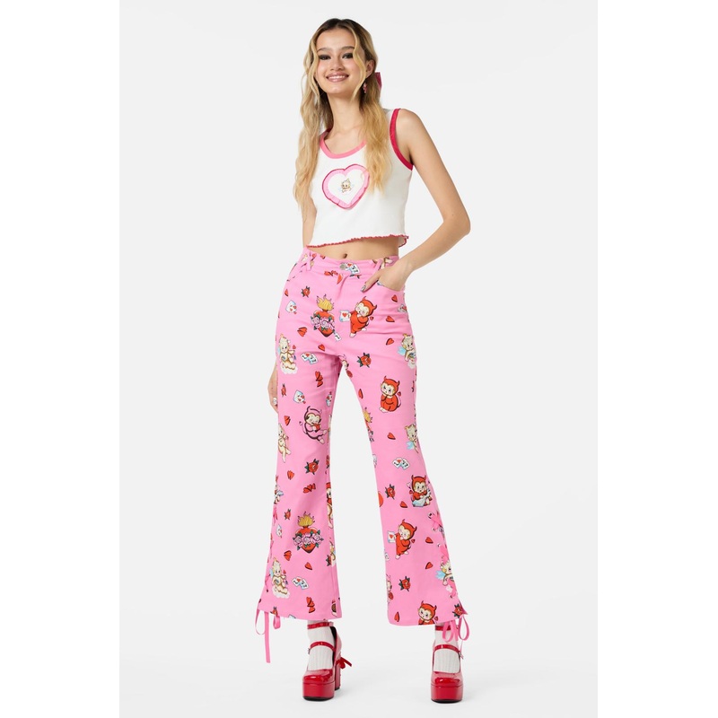 Printed Jeans -Features Repeat ‘Love Found’ Print -Has Functional Pocketing -Fitted Waistband -Includes Lacing Trim & Eyelet Details At Hem -Made From Cotton Elastane -Available In Pink