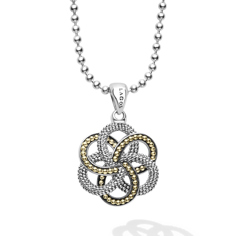 18k gold and sterling silver Caviar beaded love knot pendant on a sterling silver ball chain necklace.
