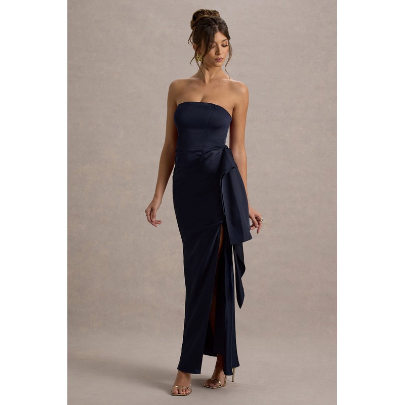 Defined by soft elegance and refined detail, Loz is a stunning choice for your most glamorous occasions. Crafted from our luxurious premium stretch satin in a delicate navy hue, this maxi dress features a chic bandeau neckline that beautifully highlights the shoulders. The expertly draped silhouette flatters the figure, while the floor-length skirt adds a touch of timeless sophistication. Trying styling Loz with sparkling accessories for a look that exudes romantic charm.