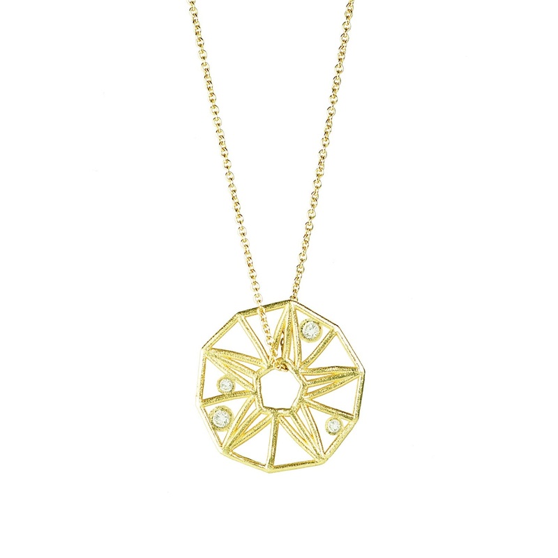 TheLucky Star Necklace is made from 18ct recycled gold,and the pendant is finished with scattered diamonds. The chain threading through the centre of the design makes it tactile and informal.Part of Claire Macfarlane Jewellery's Reach for the Stars Collect