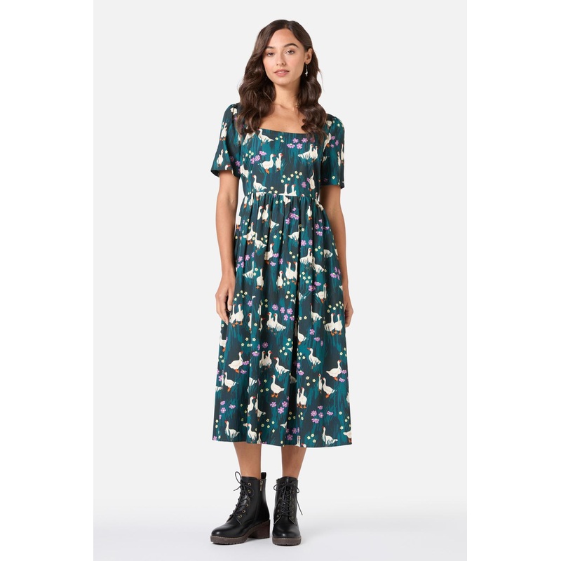 Square neck midi dress featuring a super cute print of delightful geese & little flowers in the grassy meadow.- flattering square shape neckline- gathered midi length skirt - invisible back zipper - short length sleeve- side ties to cinch at waist- made of