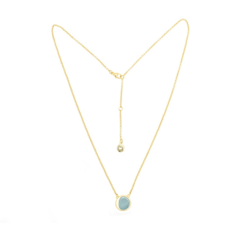 TheLUNA Flip Pendant Necklace is madefrom 18k yellow gold plated sterling silver, and features aquamarine in the gold pendant.Carry a bit of Luna energy with you as this flip pendant necklace reminds us of a sliver of the moon against a setting blue sky.Pa