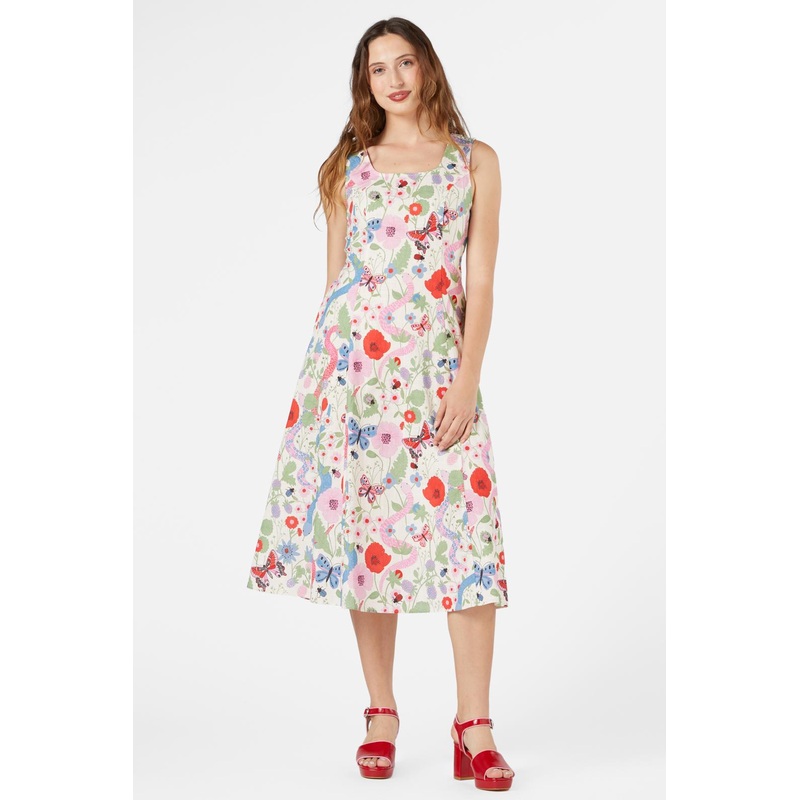 Cream sleeveless midi dress. A gorgeous printed style welcoming the year of the snake. Featuring fancy snakes, berries, butterflies, bugs & flowers.- scooped out, rounded neckline - sleeveless style - midi length, a-line styles skirt - wide side tie featur