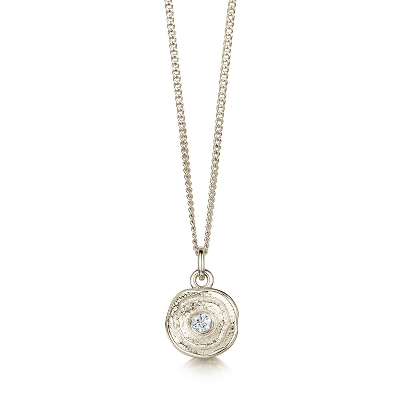 This petite Lunar pendant necklace in elegant 9ct white gold features Sheilas textured cup-mark design, delicately hanging from a gold curb chain. The slightly concave design is hand-set with a 2.9mm diamond in our Orkney workshop. The design measures appr