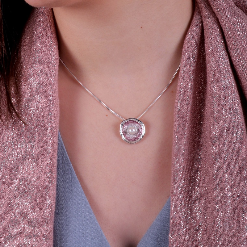 This Lunar Pearl pendant necklace in sterling silver features Sheilas cup-mark design, delicately hanging from a silver chain. The circular design has a textured finish with a slightly concave centre, hand-enamelled in 'Champagne' enamel and set with a pea