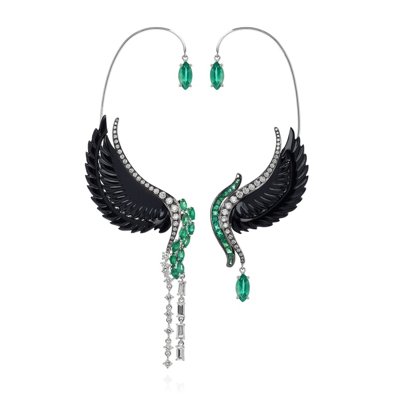 This stunning pair of asymmetrical Lust & Lure Onyx earrings are dripping with white diamonds and striking Emerald accents from Fine Jewellery designer Leyla Abdollahi. Leyla has sourced the finest quality gemstones from all over the world to create this exquisite Lust & Lure collection of bold, beautiful fine jewellery, with a touch of darkness..The lavish and seductive Lust & Lure collection from Leyla Abdollahi, is a twist combination of two collections in one. Blending the colour schemes from the 1920s into voguish, stylish and modern jewellery with a distinctive touch of designer artistry, while intriguing curves and a carefully selected range of gems such as green emeralds, white diamonds and onyx prevail through the collection.