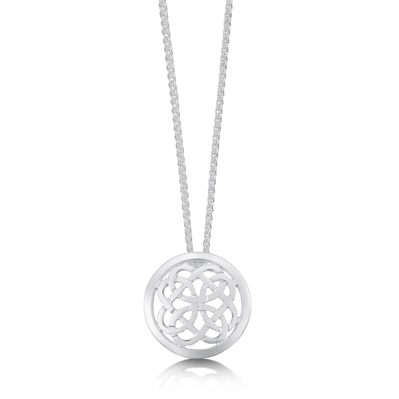 This Maid of the Loch Celtic knotwork pendant is hand-finished in our Orkney workshop in sterling silver. The design is approximately 23mm in diameter and hangs from a silver wheat chain.This collection was inspired by a Celtic knot motif on the Maid of th