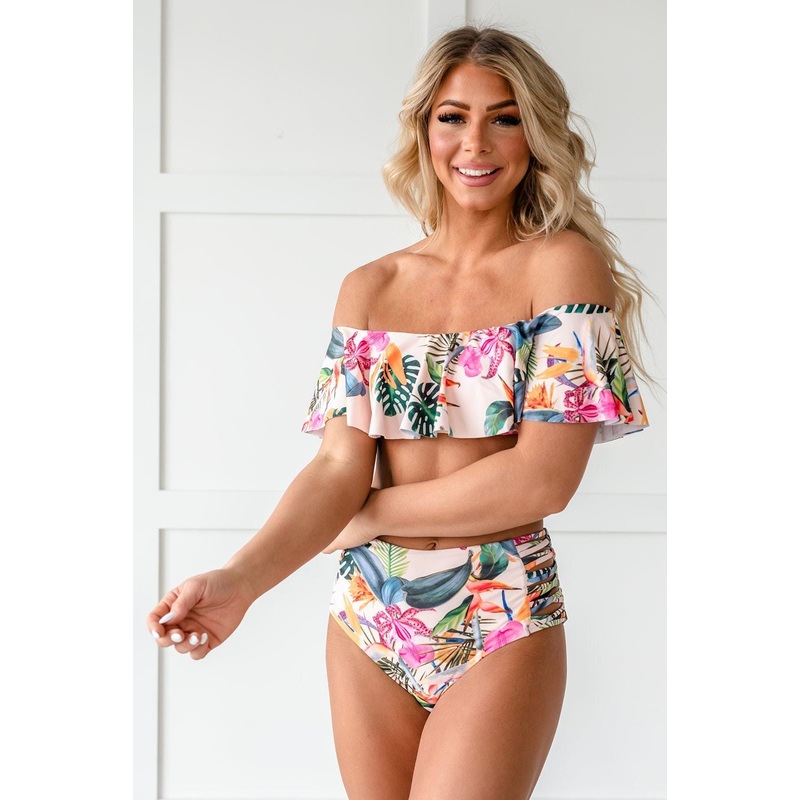 The Malibu Kisses Floral Bikini Topwill be the first item packed in your suitcase for the summer holiday! We love off-the-shoulder and ruffle detail. Plus, we love that you can either buy the matching bottoms to complete the look or you can mix and match w