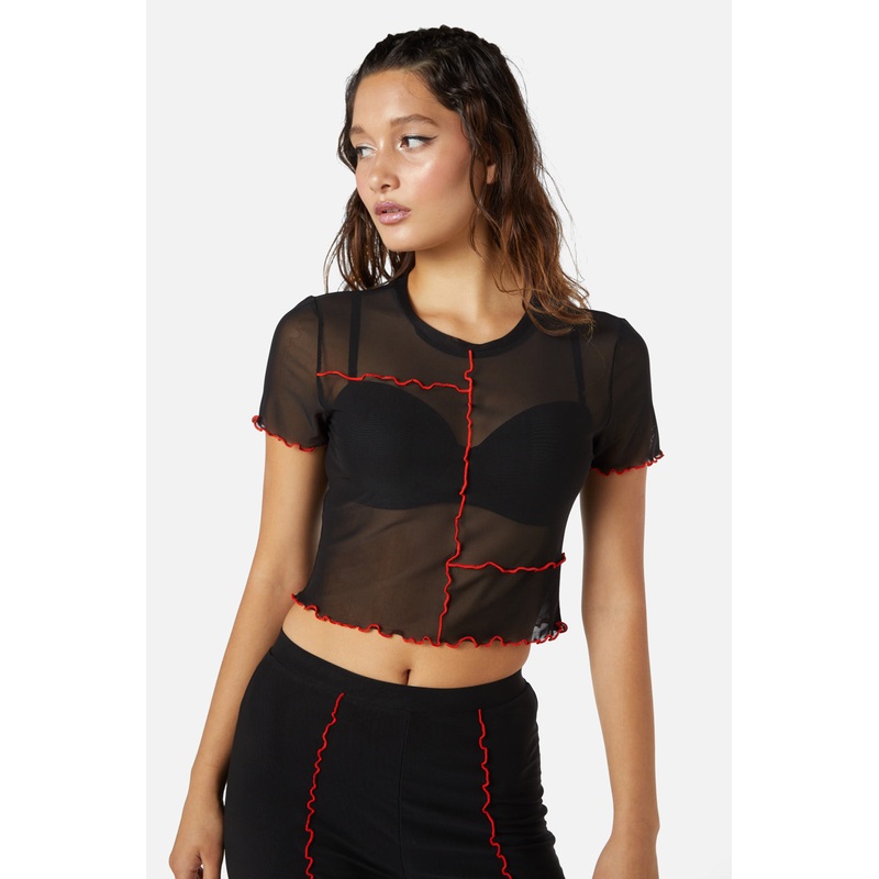 Mesh Babylock Top-Features Babylock Seam Details-Tshirt Sleeves-Bound Neck-Made From Polyester/Elastane Blend-Available In Black/Red