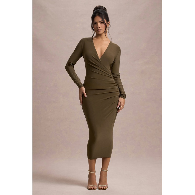 Every wardrobe needs a sculpting staple likeMarcia. Crafted in a khaki shade of our premium stretch jersey, this bodycon midi features a plunge neckline, gathered waist and long sleeves. For a sophisticated evening look, try styling Marciawith a sleek bun