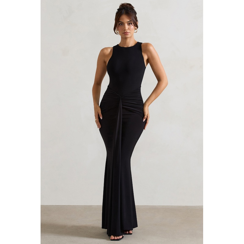 Maren | Black Racer-Neck Gathered Maxi Dress With Drape