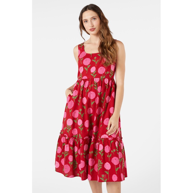 Red sleeveless midi dress featuring a beautiful marigold print- sleeveless style- soft square neckline- high bodice- princess seam shaping- gathered & tiered midi length skirt- invisible centre back zipper- made of a smooth cotton fabric- available in redP