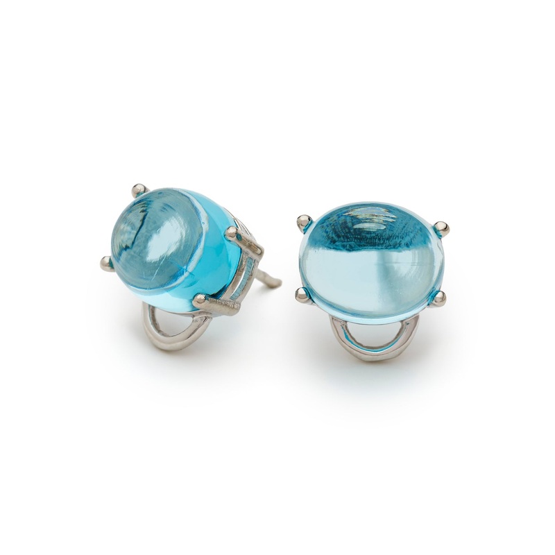 This elegant pair of Marmaris Earrings set in rhodium are created with 10 x 12mm cabochon lab grown gemstones. Pictured here in Aqua blue quartz, these striking earrings are also available in a variety of different lab grown stones including: Champagne Qua