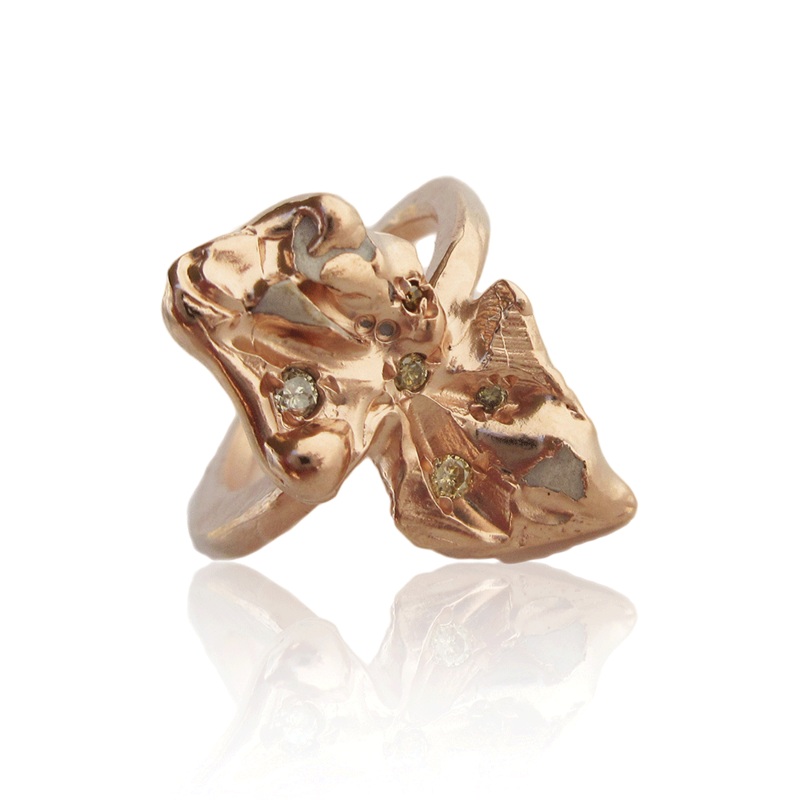 The MarpesiaRingis anelementalrose gold ring, set with recycled white porcelain and 0.01 carat coloured diamonds.Part of the Amazonian Collection by Imogen Belfield. This fiery, brave and spirited collection fuses white porcelain and diamonds with 18k rose