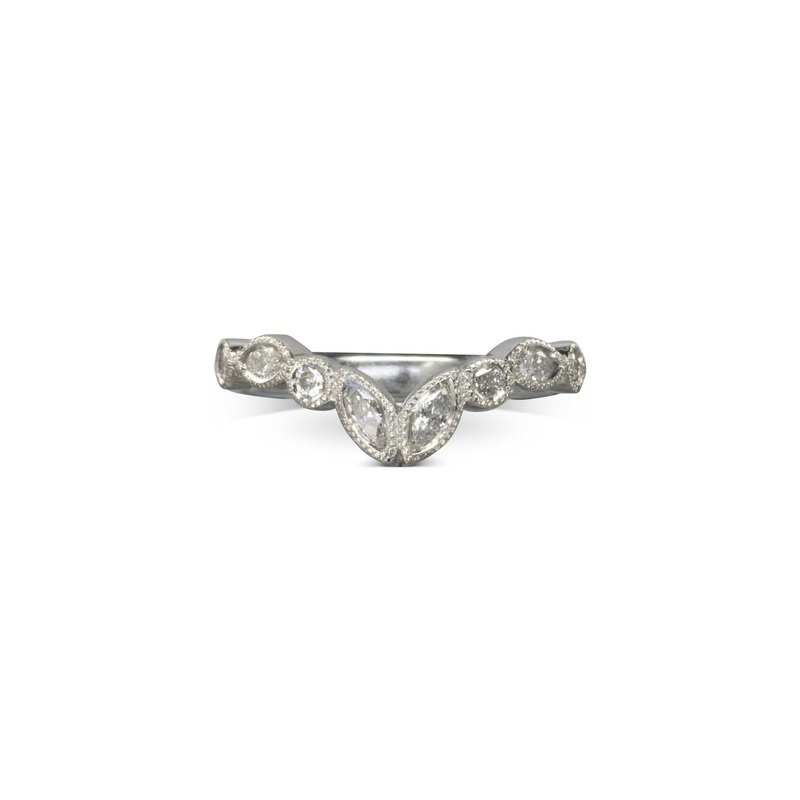 The Marquise Diamond Beaded Shaped Wedding Ring features a wishbone-shaped band that is 60% set with alternating 2mm round and four 2x4mm marquise diamonds. It is designed to fit snugly against most solitaire engagement rings.Alternating Diamonds: The band