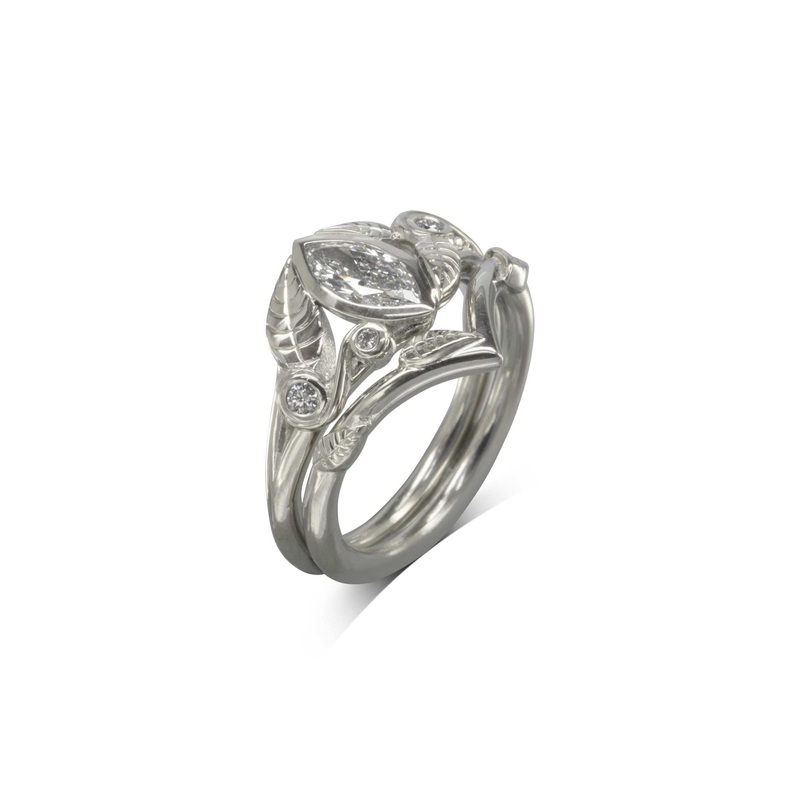 The Marquise Diamond Floral Wedding and Engagement Ring Set is a bespoke design commissioned to celebrate a unique bond. Based on our marquise diamond vintage wedding and engagement ring set, the commissioner requested a more asymmetrical vine and leaf mot