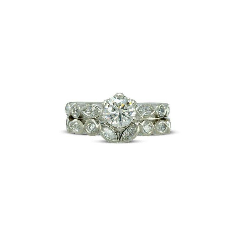The Marquise Diamond Wedding and Engagement Ring Set is designed to celebrate the unique bond you share.DiamondCenterpiece: The engagement ring features a 0.6ct (5.5mm) round brilliant cut diamond, GIA-certified GSi2, set in platinum.Alternating Diamonds: