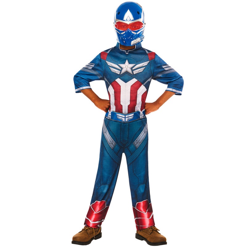 Suit up and lead the way with this Marvel Captain America Brave New World Boys Costume. This action-ready jumpsuit features bold digital prints of Caps iconic blue, red, and silver suit, complete with metallic and stitched details. The three-quarter sleeves add an authentic touch, while the easy velcro closure makes getting ready for battle a breeze. The hard plastic moulded mask, with its silver accents and red mesh eye holes, ensures your young hero looks the part while staying comfortable. Just dont forget your star shield and youve got a true superhero look for any Marvel or movie themed party.
