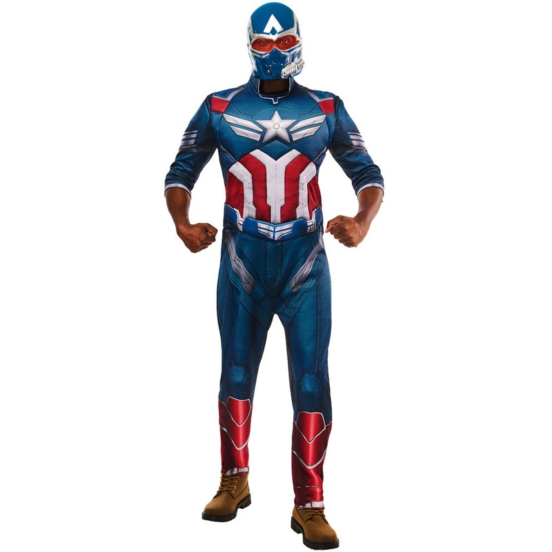 Suit up as the Star-Spangled Avenger with this Marvel Captain America Brave New World Deluxe Mens Costume. This detailed jumpsuit features striking digital prints of Caps iconic blue, red, and silver suit, complete with metallic accents and stitched details. Foam-filled padding on the chest and arms gives you that super-soldier physique, while the three-quarter sleeves add an authentic touch. The hard plastic moulded mask with its silver trim and red mesh eye holes ensures youre battle-ready for any mission. Perfect for any superheroes or Marvel themed party.