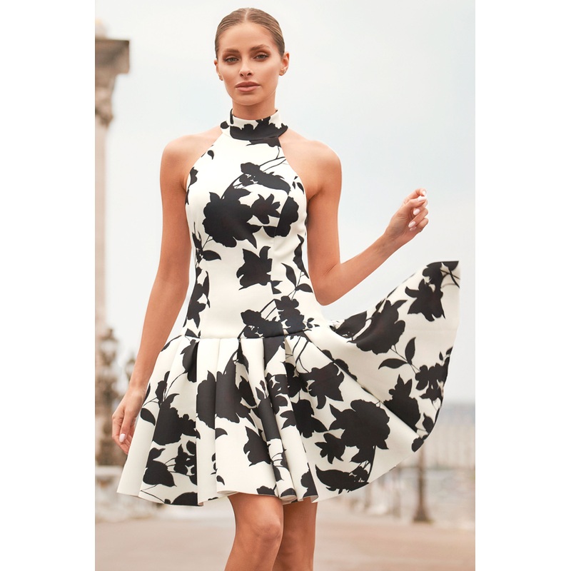 Masterpiece | Cream Floral Print High-Neck Mini Dress With Volume Hem