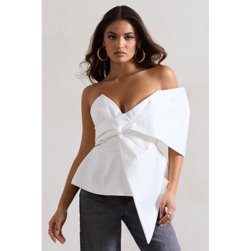 Mayfair | White Asymmetric Bardot Top With Peplum Hem