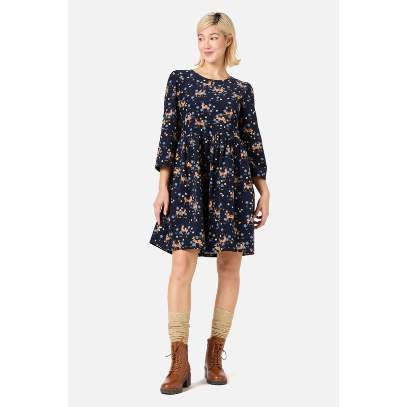 Cosy winter corduroy smock dress, printed with sweet deer amongst clusters of meadow daisies- relaxed bodice- round neckline- 3/4 length relaxed sleeves- gathered skirt- handy side pockets- length finishes at the knee- made of a soft cotton corduroy- avail