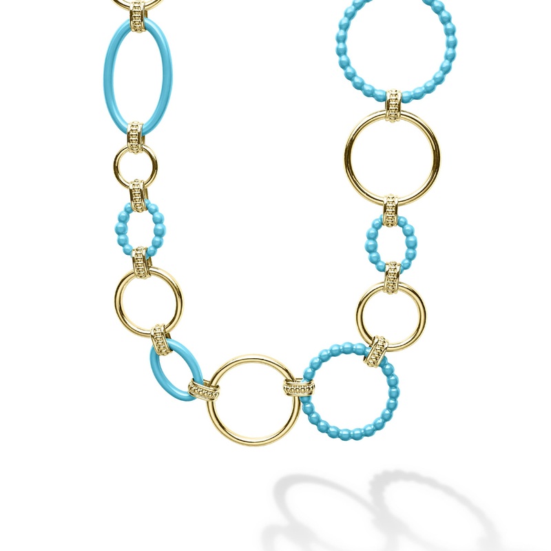 A modern necklace with 18K gold and blue ceramic round, oval and beaded links.