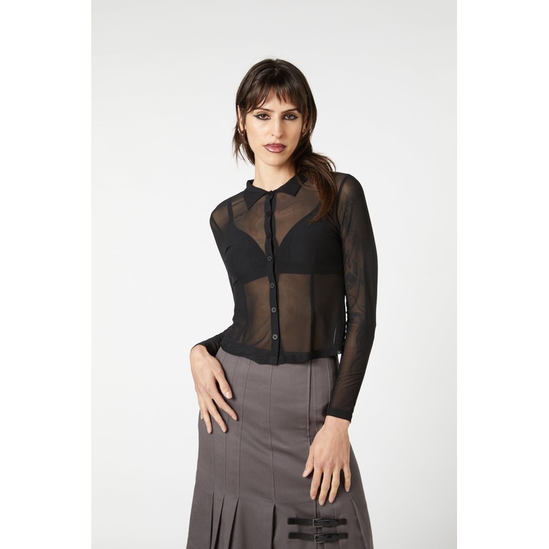 Mesh Blouse- Long Sleeves- Collar At Neckline- Button Down Closure At Front- Unlined- Made From Polyester Mesh- Available In BlackProduct Code: DGFV525
