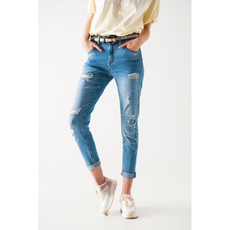 Ripped jeans continue to trend strong this season. These mid-blue jeans have a straight-leg silhouette, which updates their even more. The jeans boast of a high waist, belt loops, five functional pockets, a zip fastening, and fabric that is made from 69% C