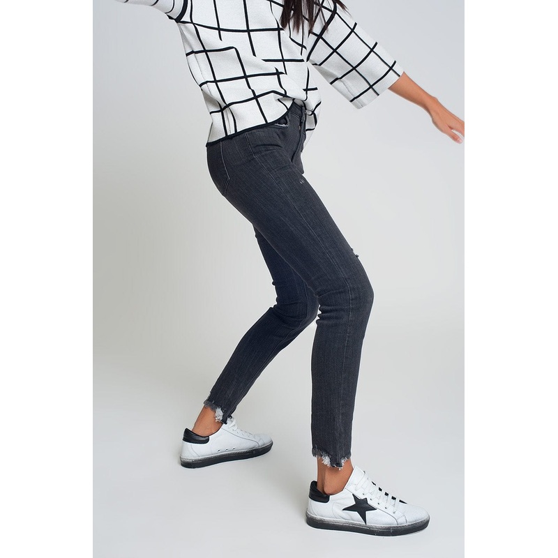 Mid Rise Jeans in Black with Raw Hem. Skinny jeans like these are perfect for pairing with the oversized tops that are trending strongly this season. The raw hem of these jeans adds just the right amount of that undone look thats so popular. The black hue