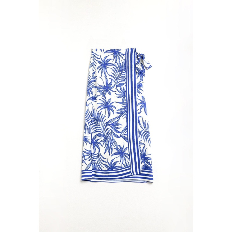 Breezy and beautiful, this midi skirt captures the essence of summer with its soft white fabric and vibrant blue tropical leaf print. The flowing silhouette moves gracefully with every step, creating an effortlessly elegant look thats perfect for everything from sunlit strolls to relaxed garden parties. The contrast between the crisp white base and bold blue motifs adds a fresh, eye-catching appeal.